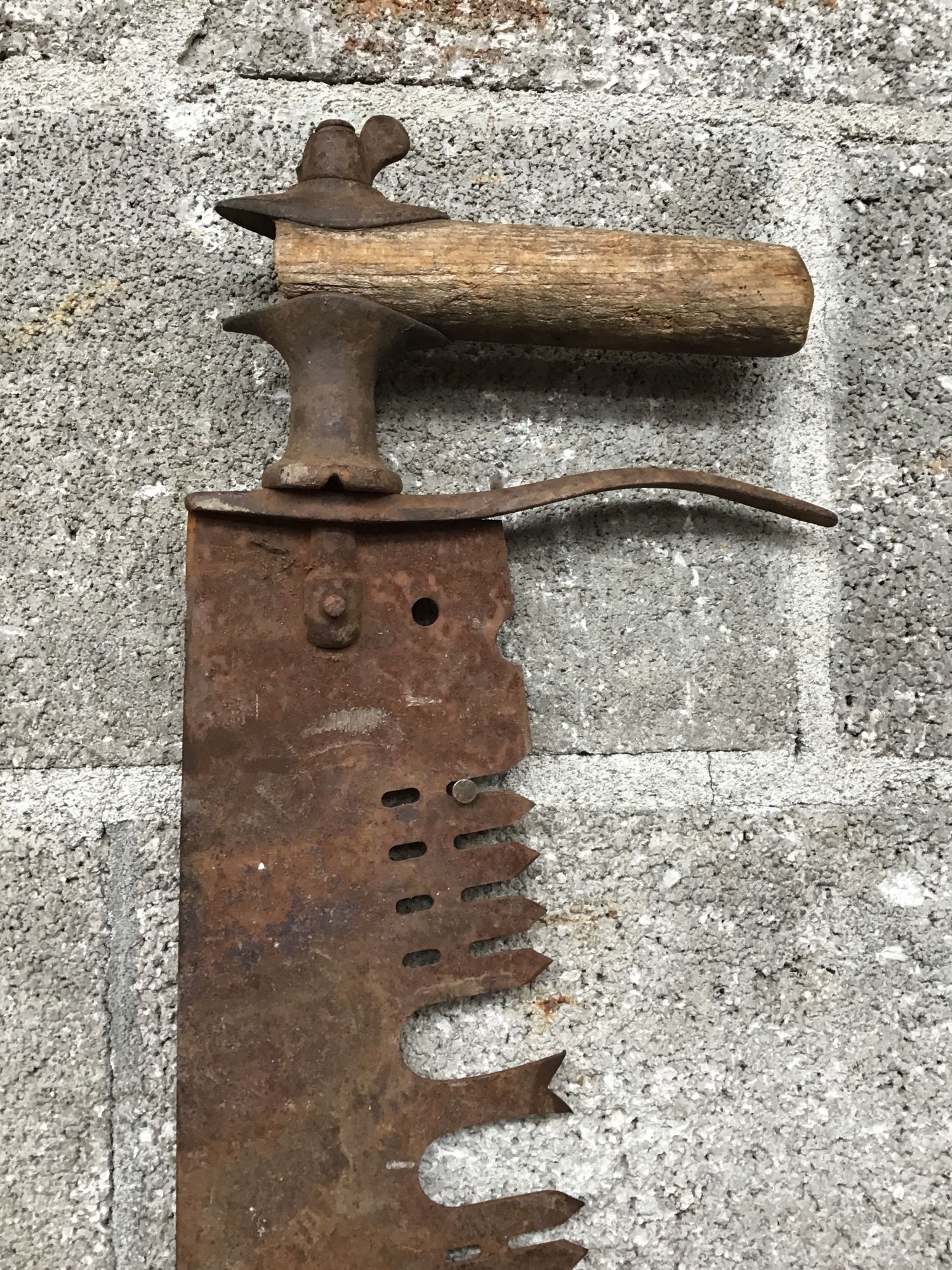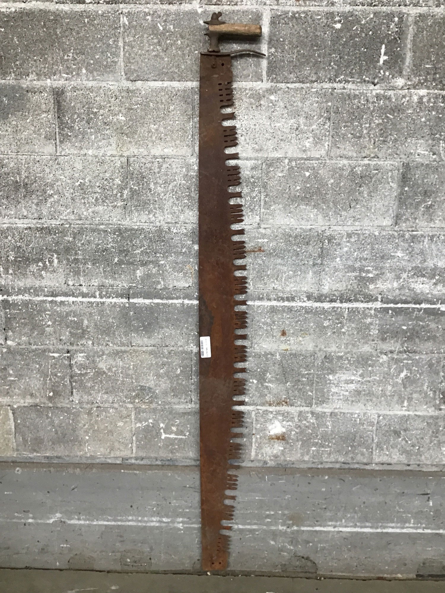 A big saw with an over 5' blade intended for dropping some big ol' trees, the kind you get Paul Bunyan to yell "Timber!" when you fell them. It only has one handle and looks like it's supposed to have two given the screw holes on the end of the blade, which is also pretty rusted out. Maybe it won't be dropping any coastal Cedars soon but it's great for a local historian's personal collection.