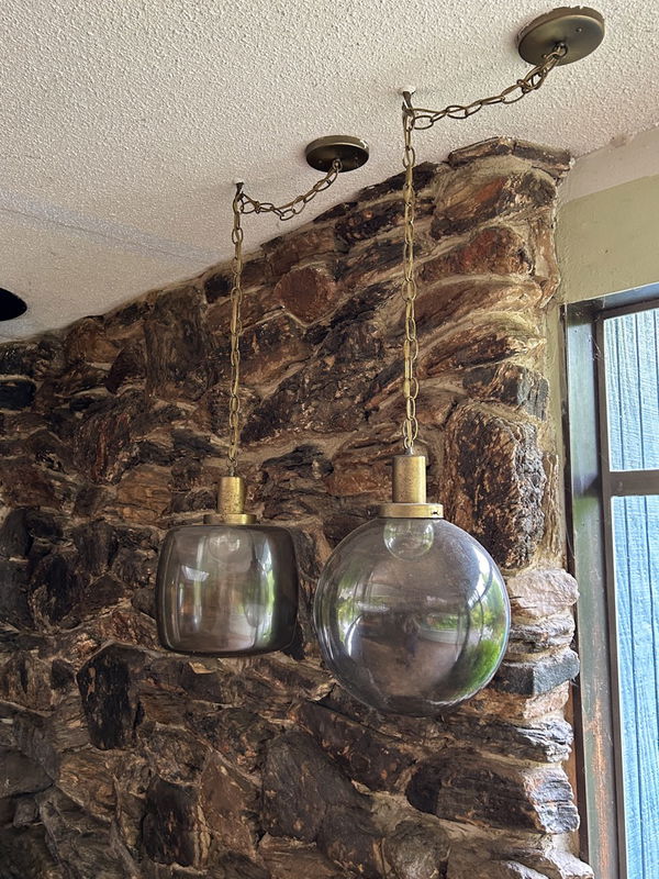 A hand blown smoke glass globe hangs from a long chain drop base. Can be used with a ceiling hook to make it a swag light if your ceilings are lower! Restored in our on site light repair workshop