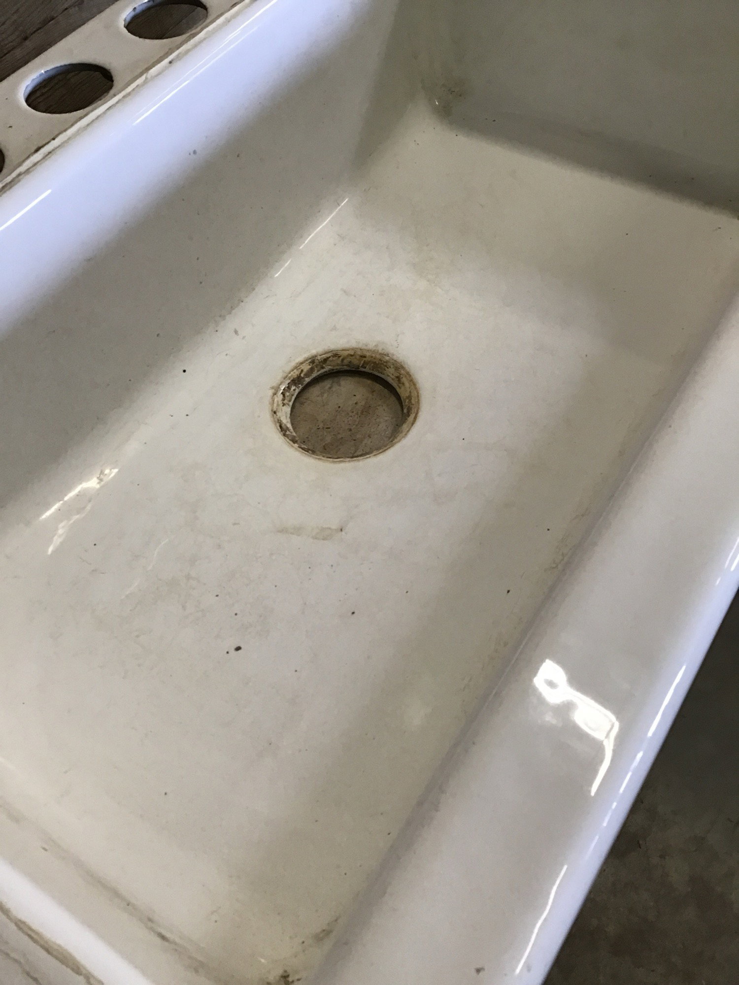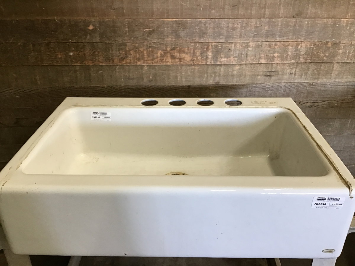 2003 Kohler enameled cast iron kitchen sink with an apron. Was installed as an undermount previously, so there is some schmutz left over around the rim. No major dings, just needs a proper clean up!