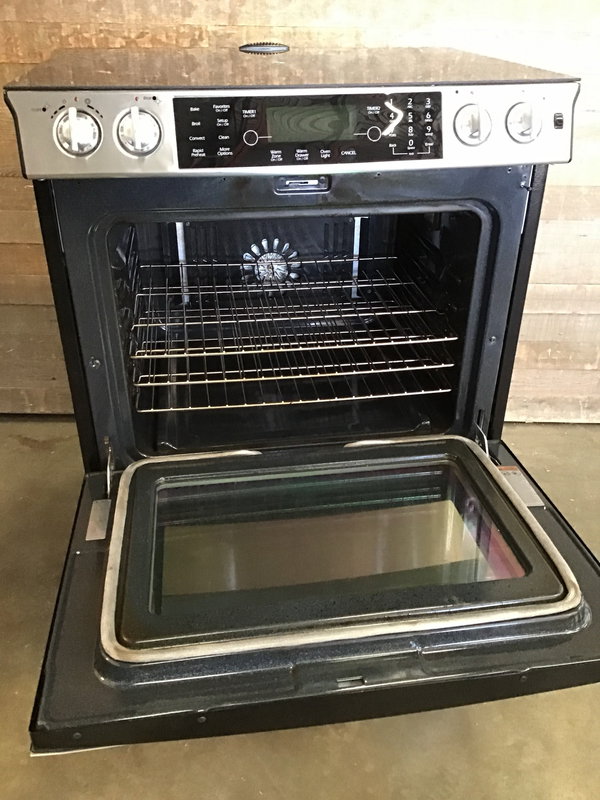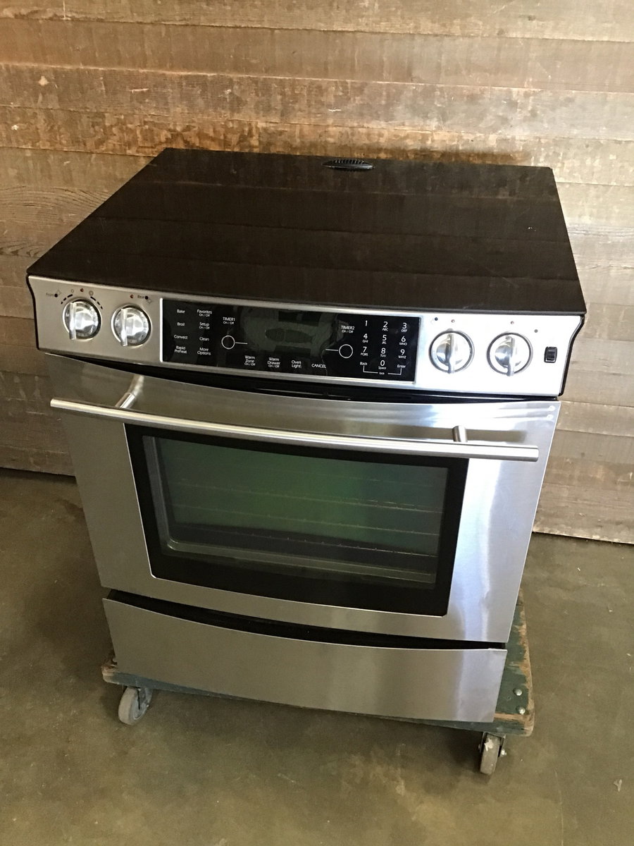2008 Stainless steel Jenn-Air electric slide in range in good, used condition. Tested in house, all burners heat up and the oven got to temp. This beauty has four standard burners and a warming burner, a warming drawer, and has self cleaning and convection options. Very clean for it's age and looks like it was not heavily used over the years. The top is glass and very clean, though there is a small chip out of the glass at the back right hand corner.