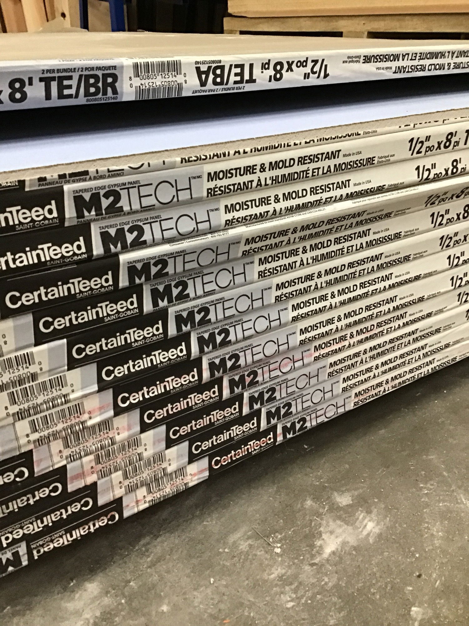 1/2" 4'x8' moisture and mold resistant gypsum board by CertainTeed. Condition for each sheet varies with some minor corner damage here and there. Overall in good condition but hurry for the best selection. This is a bulk item. No holds please.