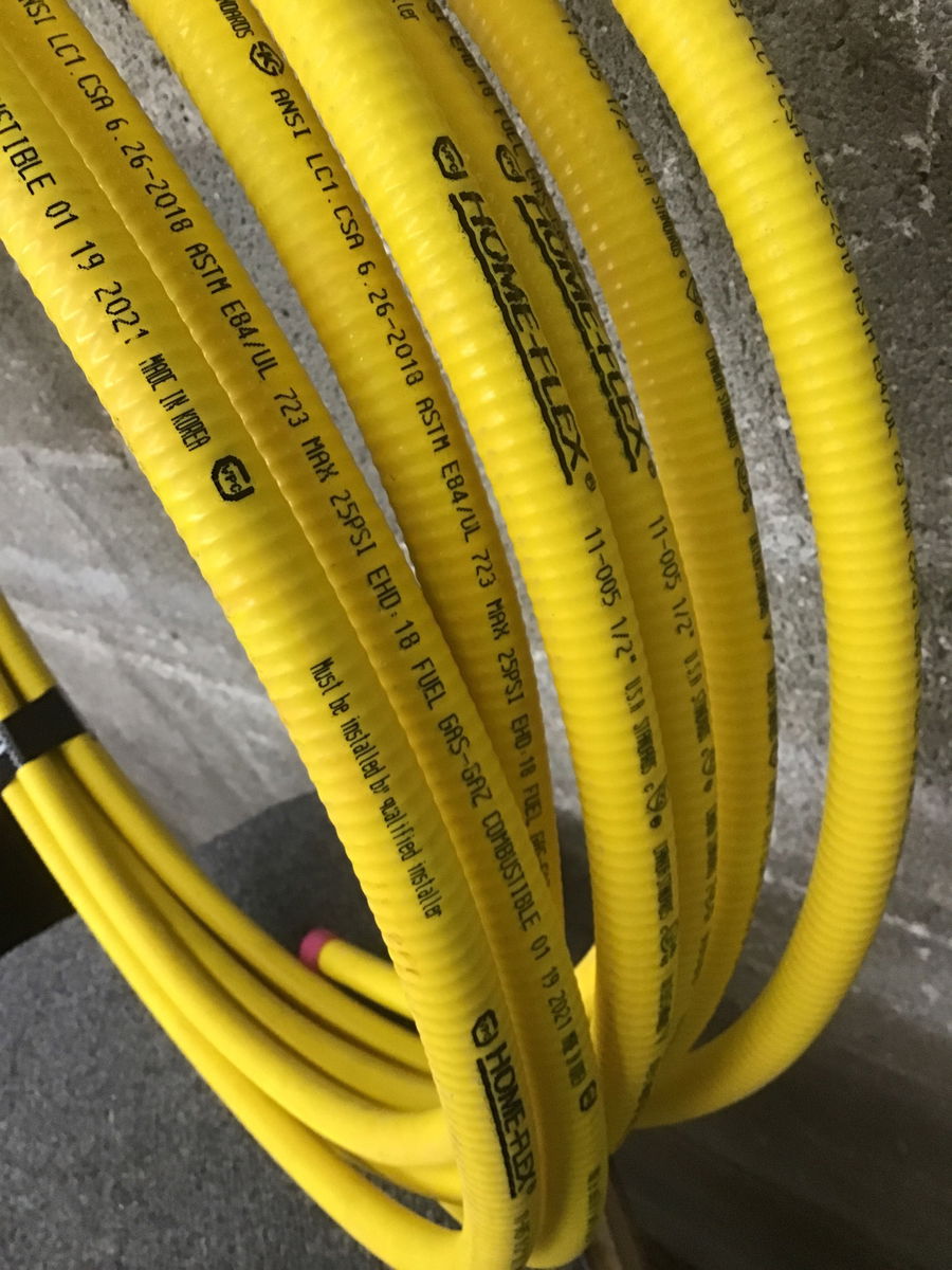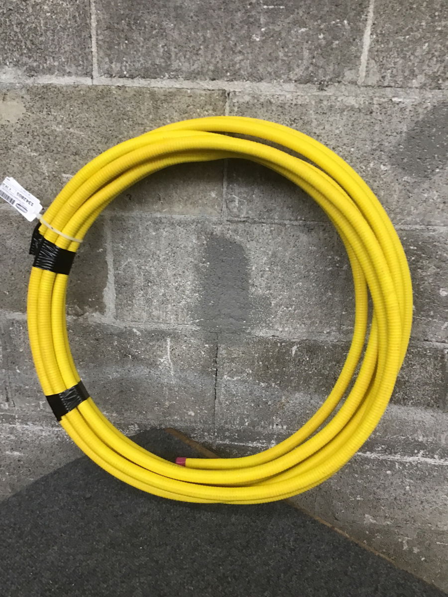 A yellow roll of Corrugated Stainless Steel Flex Tubing with what looks to be a total length around 25'.