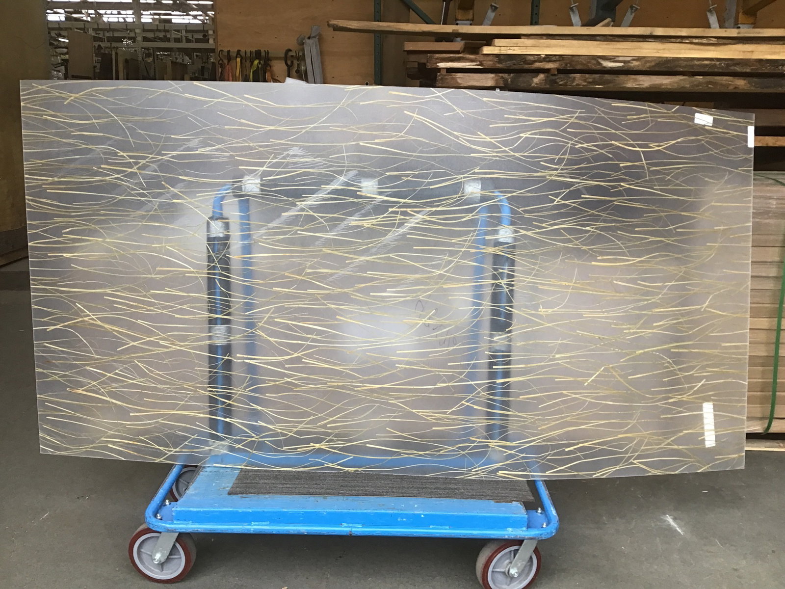 This high end 1/8” thick 48"x96" acrylic sheet in a "Bay Grass Vertical" pattern that appears to be made from a sandwich of real grass in a clear matrix! It still has the plastic film on it. It’s a remnant from a commercial project, produced by Lumicor. This sheet retails for over $1100, but you can get it for a fraction of the cost. Photo may be representational.