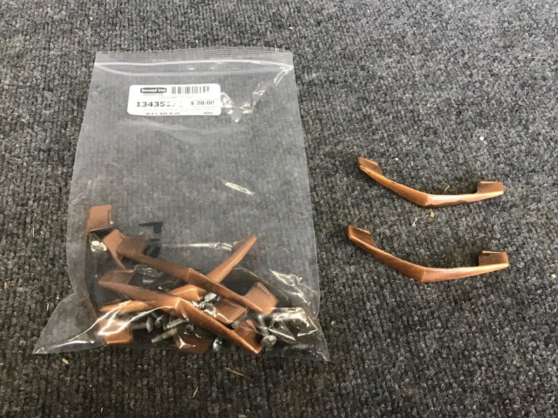 Pack of ten chevron cabinet pulls with a copper finish that's showing some wear from age.
