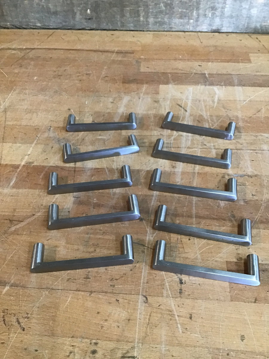 Good looking cabinet pulls in a stunning satin nickel finish. Appear to be made of brass. Photo may be representational.
