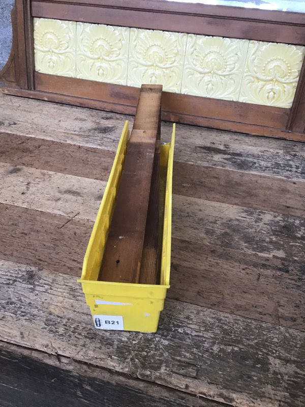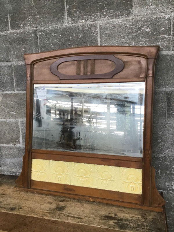 Beautiful vintage wood framed mirror that features some artistic floral tiles, bevelled mirror glass and a hint of flair in the woodworking. This once sat on top of a dresser or vanity but could be repurposed as a wall mirror! Includes two wooden brackets that would have attached it to the dresser or vanity it once belonged to.