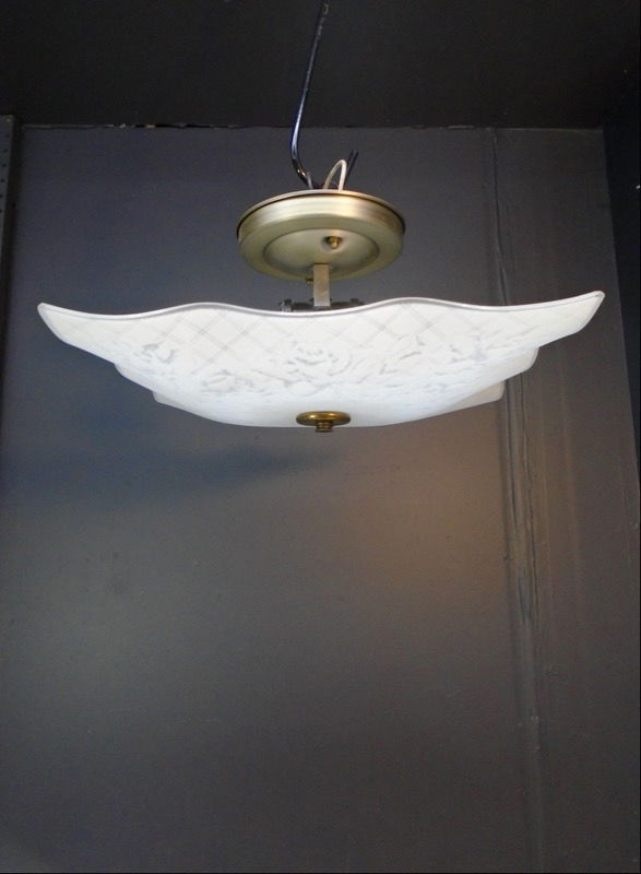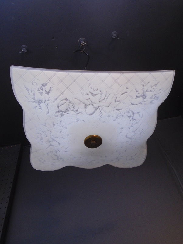 Pretty, square bedroom light with ruffled frosted glass shade. Vintage shade is from the early part of the 20th century, either the 1920s or 1930s. Shade is frosted glass with a floral pattern. Built in house with 2 socket cluster and new fitter.