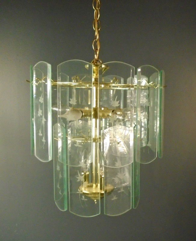 A 5 light chandelier from the late seventies to the early eighties the glass panels that are etched with a leaf design that hang on the brass base. Should be rewired, so if you are interested, check out our Second Use Lighting Services!