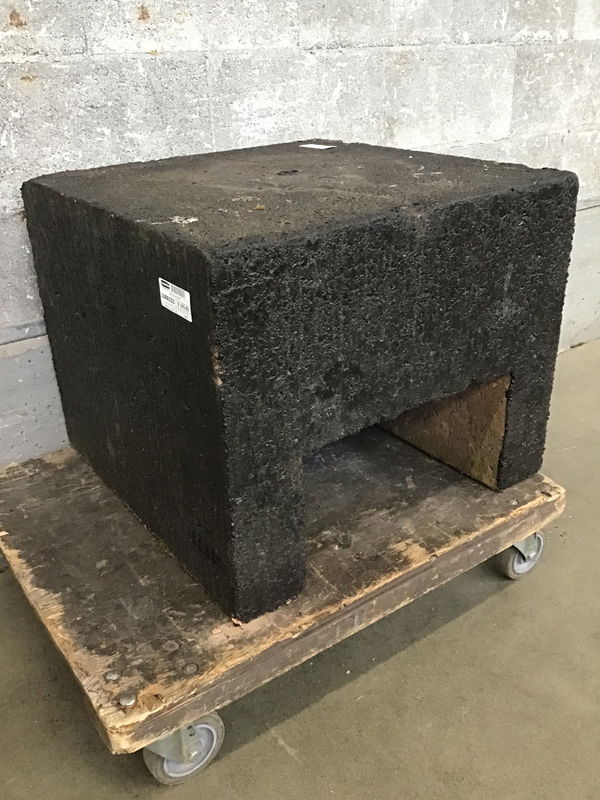 Big black concrete block. Space underneath to get a forklift under it for easier moving. Has a 1.25" hole running down the center from the top, could fit an umbrella or leg for a large tent.