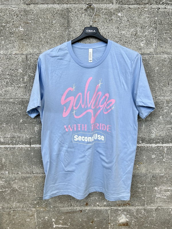 Second Use is the self-proclaimed "World's Queerest Salvage Yard". Show pride for your LGBTQIA community and for reuse in one fell swoop! This baby blue 100% cotton tee has the in-house designed "Salvage With Pride" design printed in pink and white ink. Hand screen printed in Seattle. Unisex size XL.