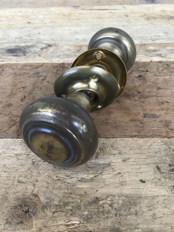 Brassy and classy antique knob set with the clean design lines associated with the Art-Deco Era. Paint removed in house. Distance between knobs is adjustable. Steel knobs with brass escutcheons.