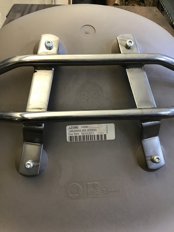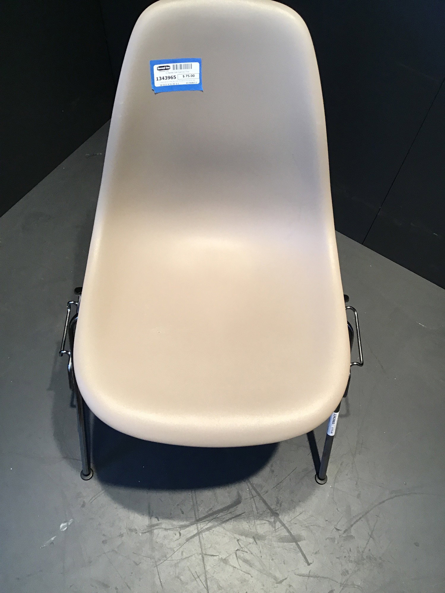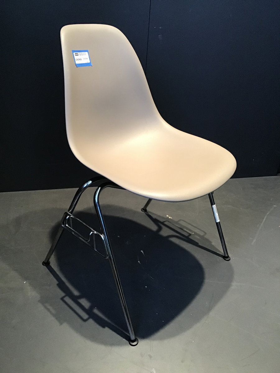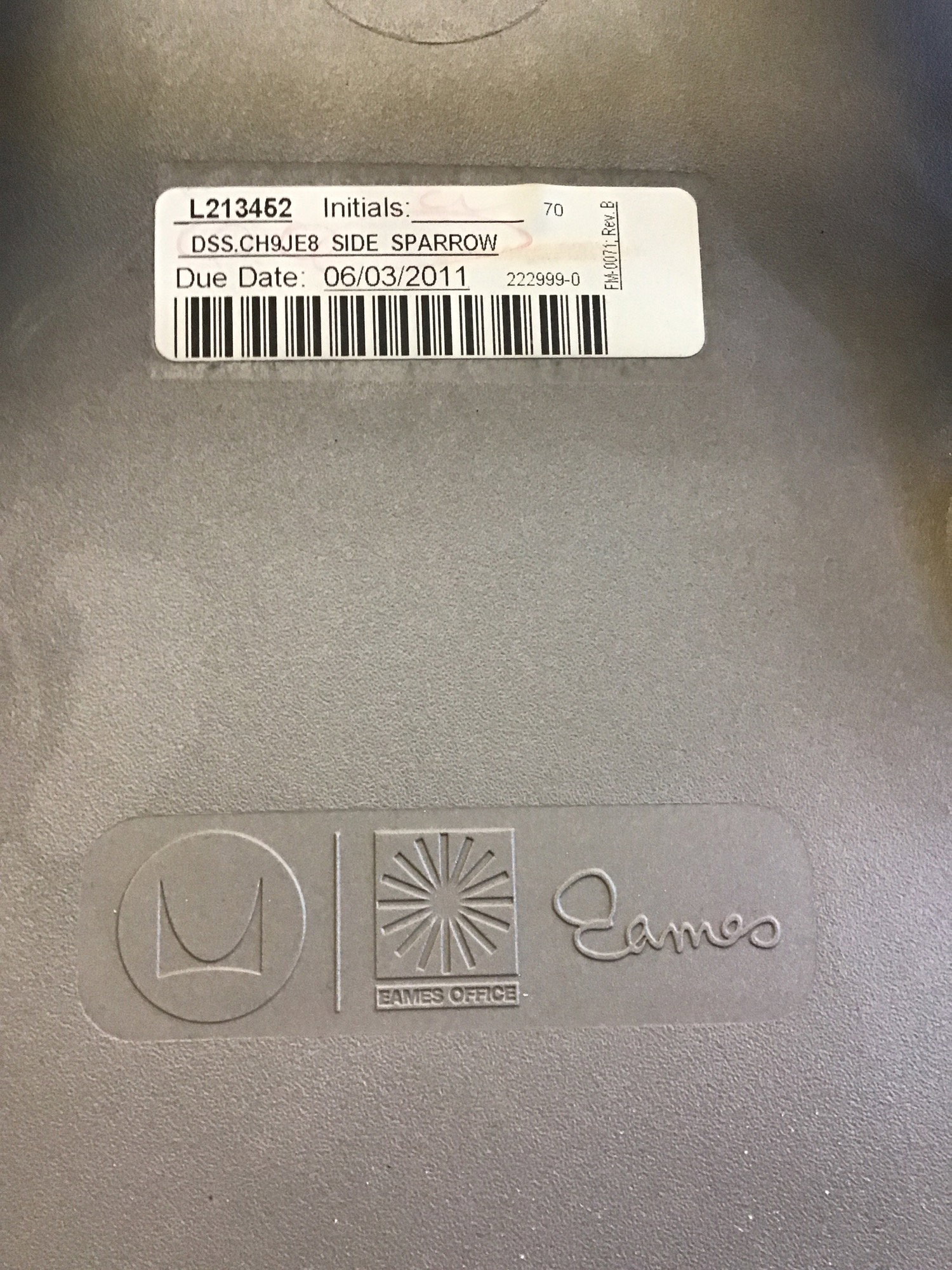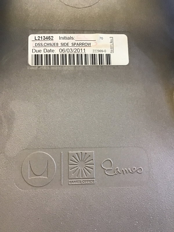 There's still an order tag under the seat of this Eames designed and marked "Side Sparrow" and made in 2011. The chrome finished steel base and putty colored moulded plastic seat look to still be in good, used condition.