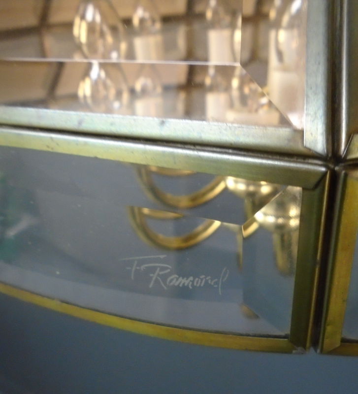 A rare 1980s Fredrick Ramond 9 bulb dining room chandelier. Has a shade of clear and melon beveled glass, one of which has the signature of F. Ramond. Has a brand new power supply cord and ground wire.