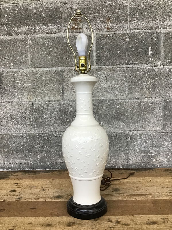 Arriving from a local home, this vintage table lamp features a single socket, a ceramic body, raised floral details, and a black base. Appeared to function when tested. Some wear from previous use.