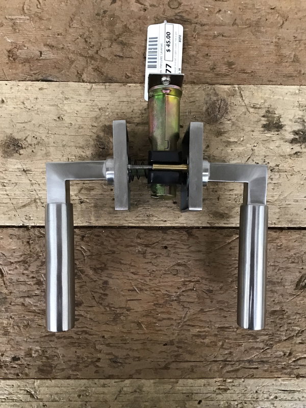 Emtek 'Hercules' passage lever set in satin nickel. Has a good quality feel and modern look. See it retailing new here