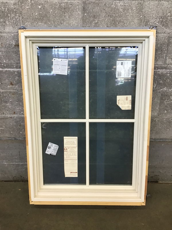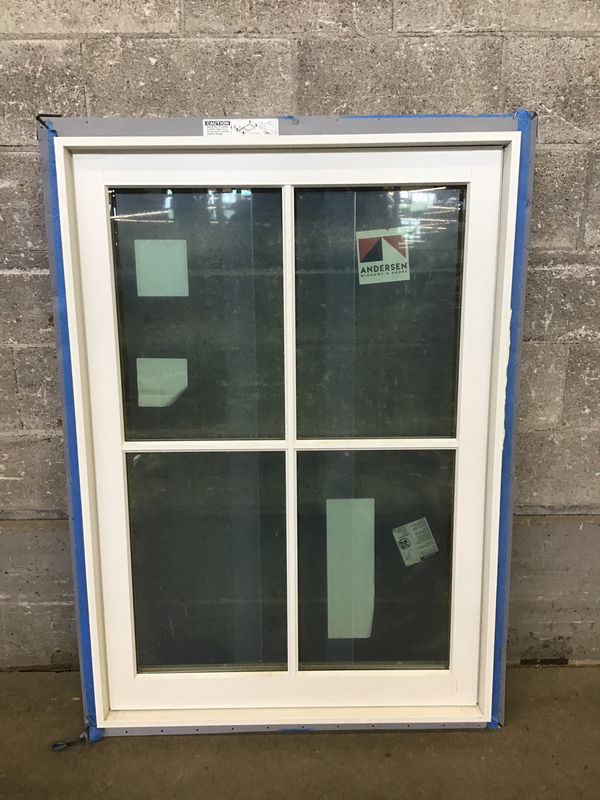 Briefly installed 2022 Andersen window with energy tags attached. The exterior is white-finished aluminum and the interior is primed wood.