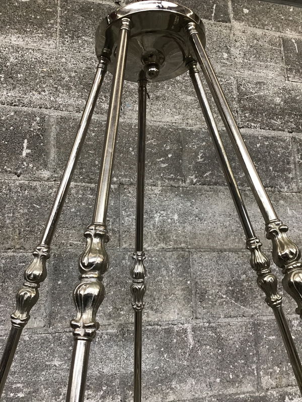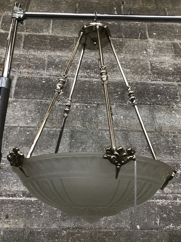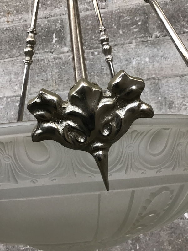 A beautiful Rejuvenation chandelier with five arms in a Polished Nickel finish that hold up an ornate frosted glass bowl shade. Has three sockets for bulbs, which are attached to the strut connecting the three load-bearing arms. The kind of light you put twenty feet in the air above the foyer of a big house.
