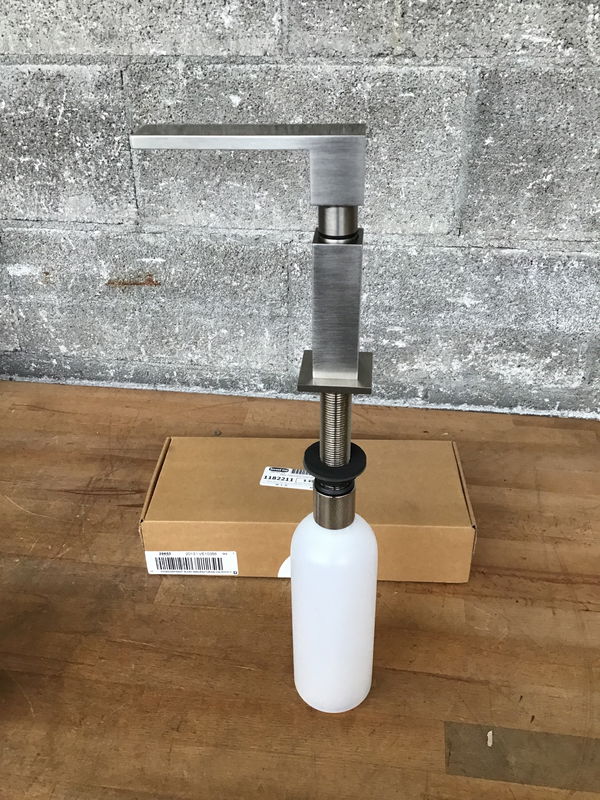 Brand new in box, this is an Elkay deck-mounted soap/lotion dispenser from their Crosstown Collection with a brushed nickel finish. Retails new for around $200.