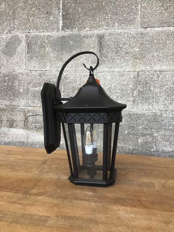 Straight from the showroom, this outdoor lantern sconce features two candle-style lights, a cute waffle-cone-esque border, and a matte black finish.