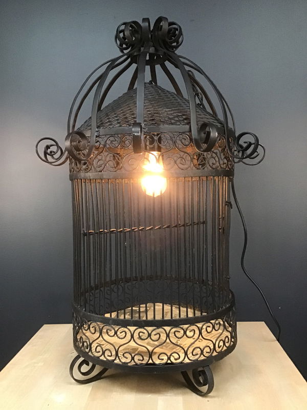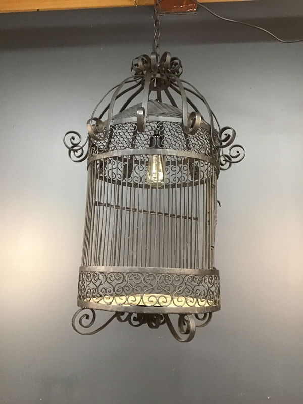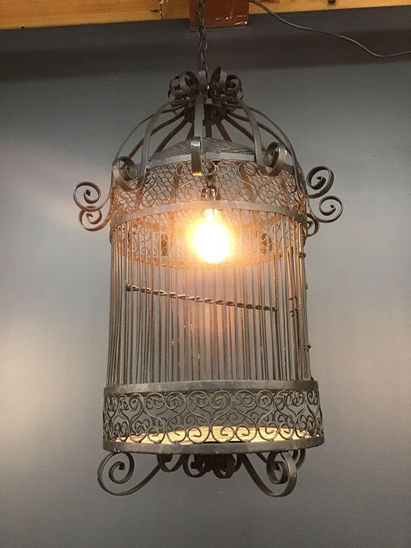 A big black bird cage has been repurposed into a cool plug in pendant light! The newsprint that lines the bottom is from a 1954 Los Angeles Times, and is not original to the cage, so no poop here! Would be awesome hanging in a covered patio! Can also sit on a table or the floor! Oh! The fun possibilities! Wired up in our on site light repair workshop #RoyalHunter