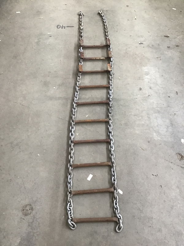 Salvaged from the Foss Tugboat Shipyard in Queen Anne, this beefy steel chain ladder is full of history AND repurposing potential. It would make a pretty epic treehouse ladder if I do say so myself. Three of the rungs have mounting brackets, the rest hang loosely. Spacing between rungs is approximately 10", width measures 20.75". Height listed is rung-to-rung, the full length of chain measures 150".