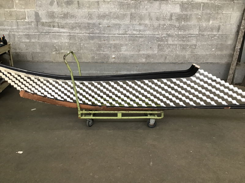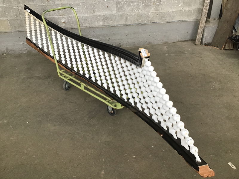 This curved banister is is over 9' long from tip to tip. Guessing it's over 10' if you measure the arc. There are twenty-five bubbleliscious balusters that could be repurposed for another project.