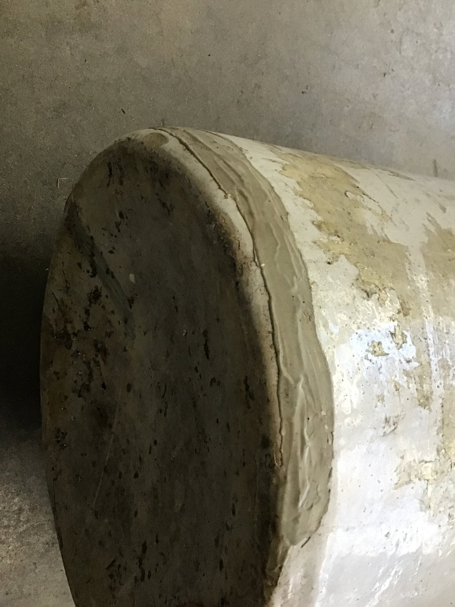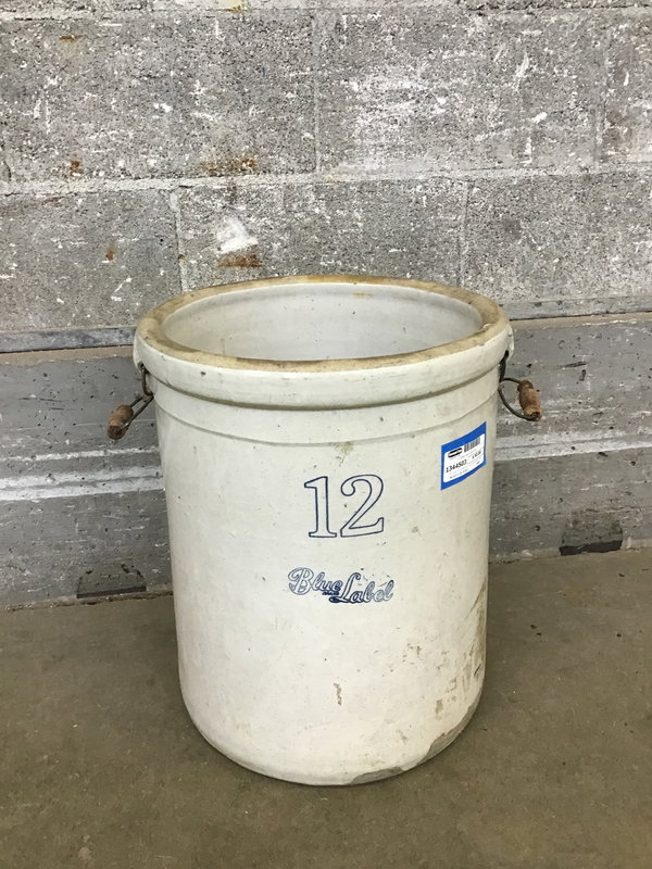 There looks to be a repaired crack around the bottom of the vintage, possibly antique, crock with a nice Blue Label logo on it. Price reflects condition.