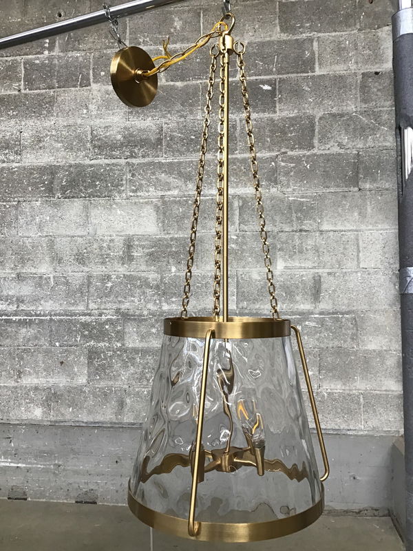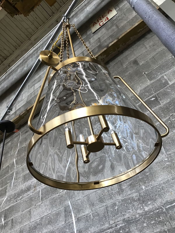 A funky li'l pendant fixture that uses four candlestick style bulbs, surrounded by what looks like a lampshade made of clear water glass with a warm brass finish to its steel construction. This pendant was produced by Savoy House, where it currently retails new for about $440.