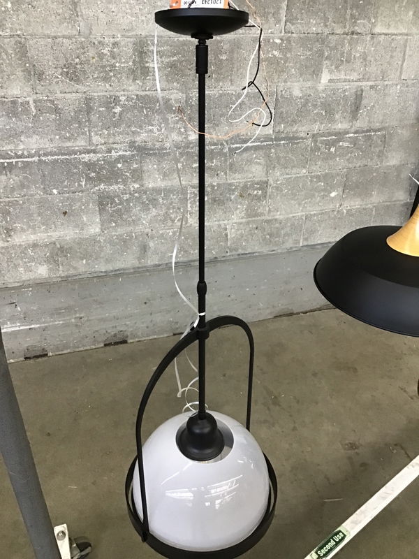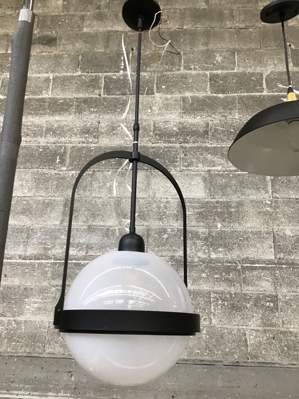 This pendant's a real treat- only made to order, this fixture was made by Hubbardton Forge as part of their Atlas Collection. From their webpage about the Atlas Collection, pieces in the Atlas Collection have a "schoolhouse style vibe blended with a neoclassical spirit, making it a versatile option for modern kitchens, entryways and other spaces in need of a balance of form and function." This striking piece features a matte black finish to its steel construction, and an opal glass globe around its single bulb. This pendant retails new for about $1,300.