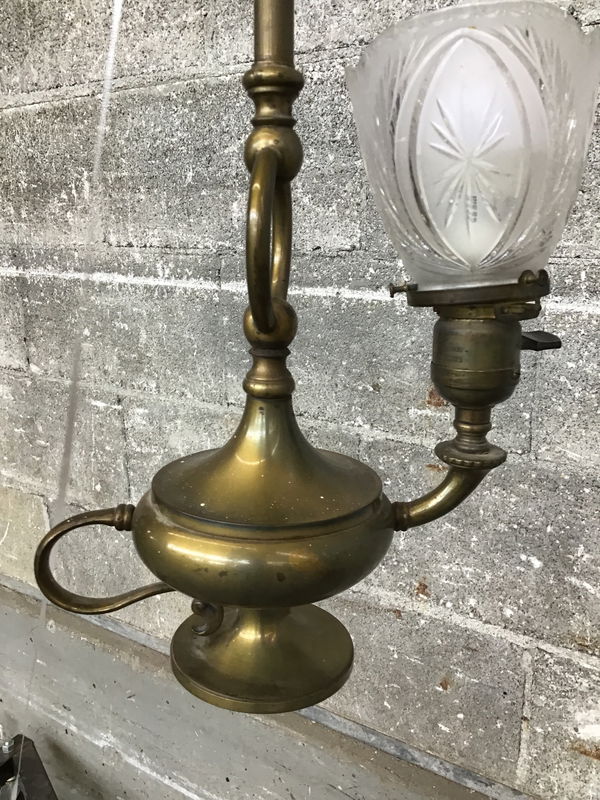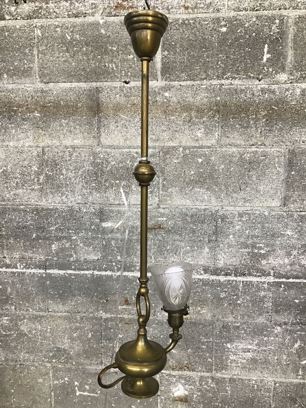 Antique gas fueled brass pendant light fixture that was converted to electric at some point. It has an elegant presence and very unique look, this would look great in a turn of the century home. Definitely needs rewired-our in-house lightshop may be able to help, check them out here