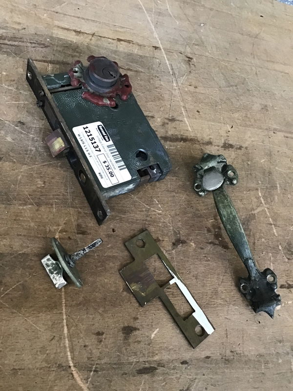 Vintage Welch exterior door handle set with mortise lock, strike plate, key cylinder and handle set. There's no interior knob and escutcheon. The handle and thumb depressor are free of paint, but the matching escutcheon around the key cylinder (no key included) has some residual red paint.