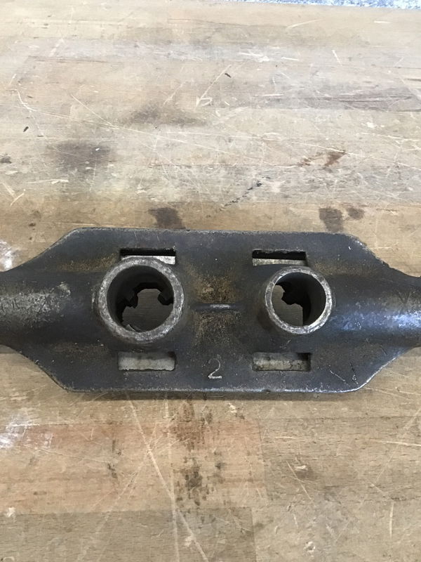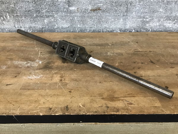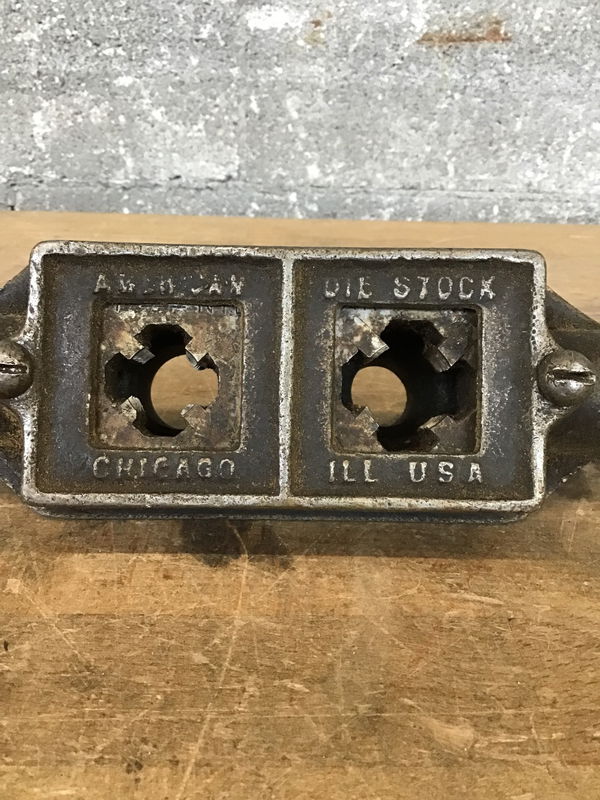 We don't know how old this handle is but it could be well over 100 years old. It's labeled with "AMERICAN DIE STOCK CHICAGO ILL USA" and that's pretty much all we know about it. It comes with two dies inside, one sized at 1/2 R and one at 3/4 R. We're not familiar with these thread sizes so we'll leave that up to you.
