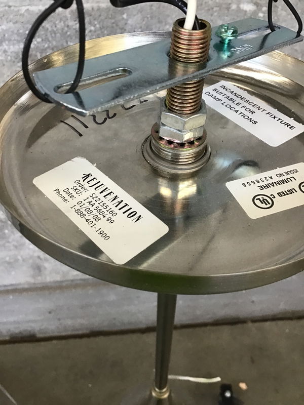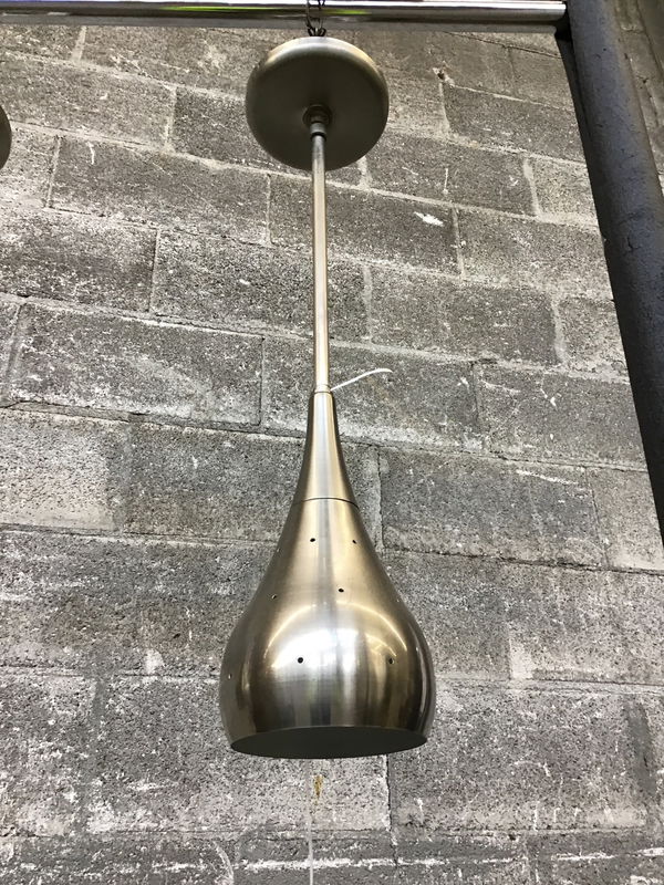 Hershey Kiss shaped pendant light with a brushed nickel finish and perforated shade by Rejuvenation. It's dated 2008, but vintage style never fades, amiright? Suitable for damp locations.