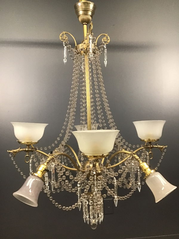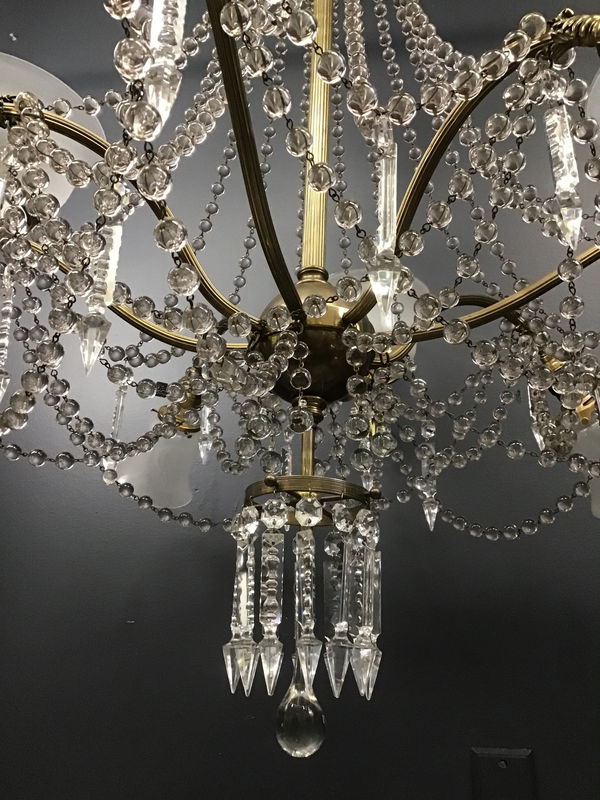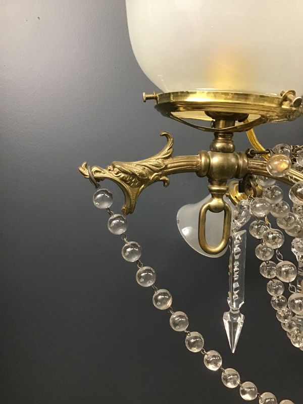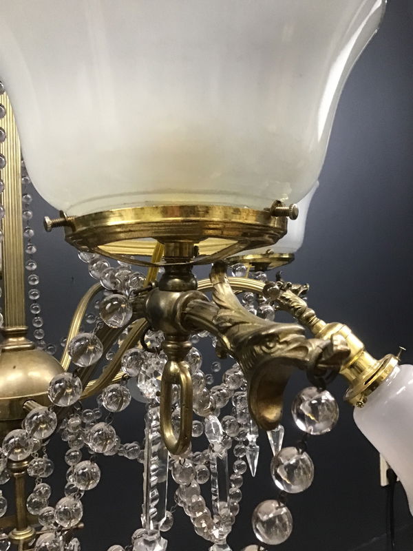 An absolutely gorgeous late 19th Century chandelier with loads of glass beads, crystal icicles, frosted shades, and four dragon heads! It was originally both wired for electricity and plumbed for gas. The upwards facing shades had been gas, while the downward facing, the electricity. All have been rewired and use standard bulbs. There are some small chips in some of the shades, but I think it could be said for all of us, that at age 125, we'll all have a few chips to speak of! The glass beads, and the shades all contain manganese, so they not only have a slight purple tint, but they also will glow a faint green when exposed to a UV365 lamp! Restored in our on site light repair workshop!