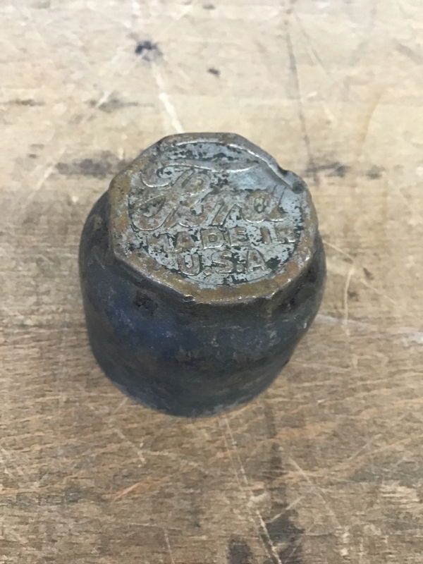 This is what looks to be an original Ford Model T brass grease cap used on each wheel hub. Very cool!