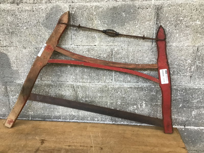 There's no maker's mark on this antique bow saw, but it's a handsome one all the same! The frame is a hair bent, but the blade is straight and in good shape.