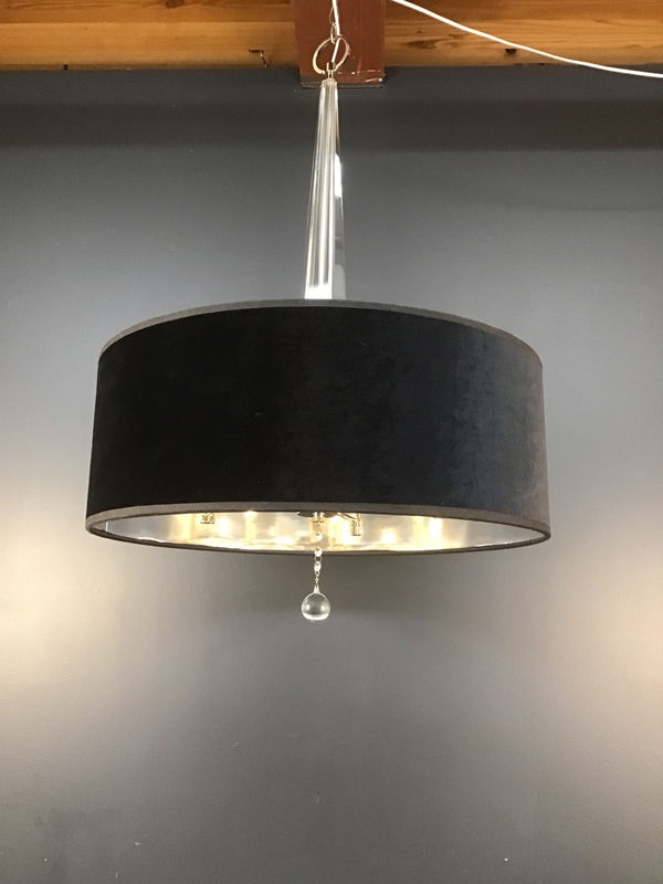 A lobely black velvet shade with a silver lining hangs onver a chrome and glass four light chandelier that comes with 14' of white cord, with a plug and inline switch. Perfect for apartment dwellers! Rewired in our on site light repair workshop