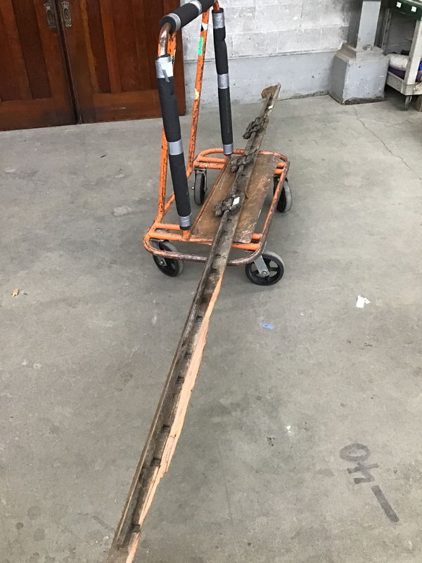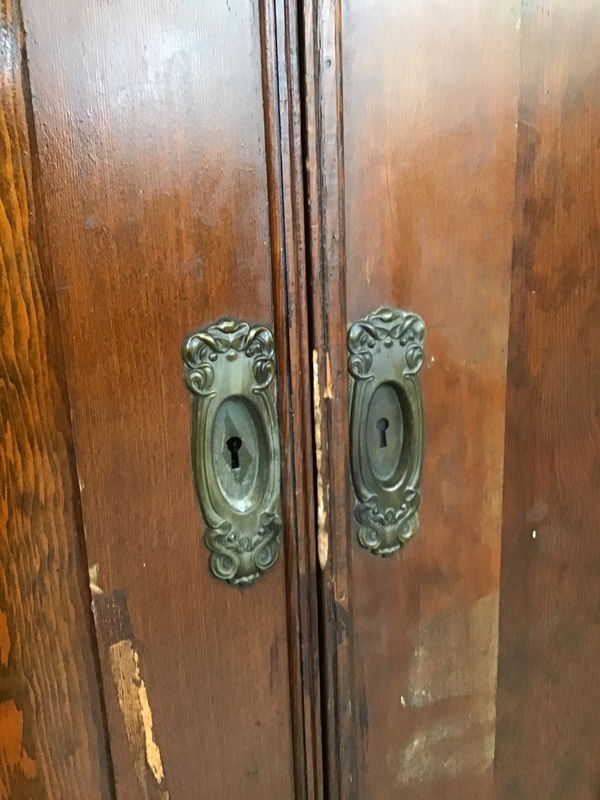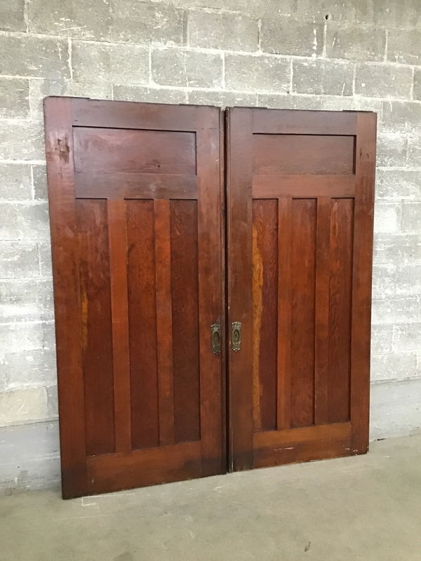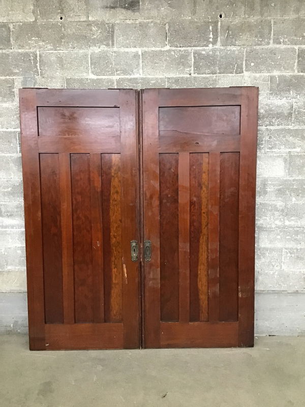 This pair of pocket doors is about as good as they come. Each features four shaker style panels in a craftsman layout with decadent stamped steel pulls. Both still have their hardware on top for easy mounting to the 144-5/8" track and rollers that came with them. One has a split panel and the other a split stile with a curious hole in the rail next to it, but even with those flaws this is still a gorgeous pair with a great look. Dimensions listed are for each door.