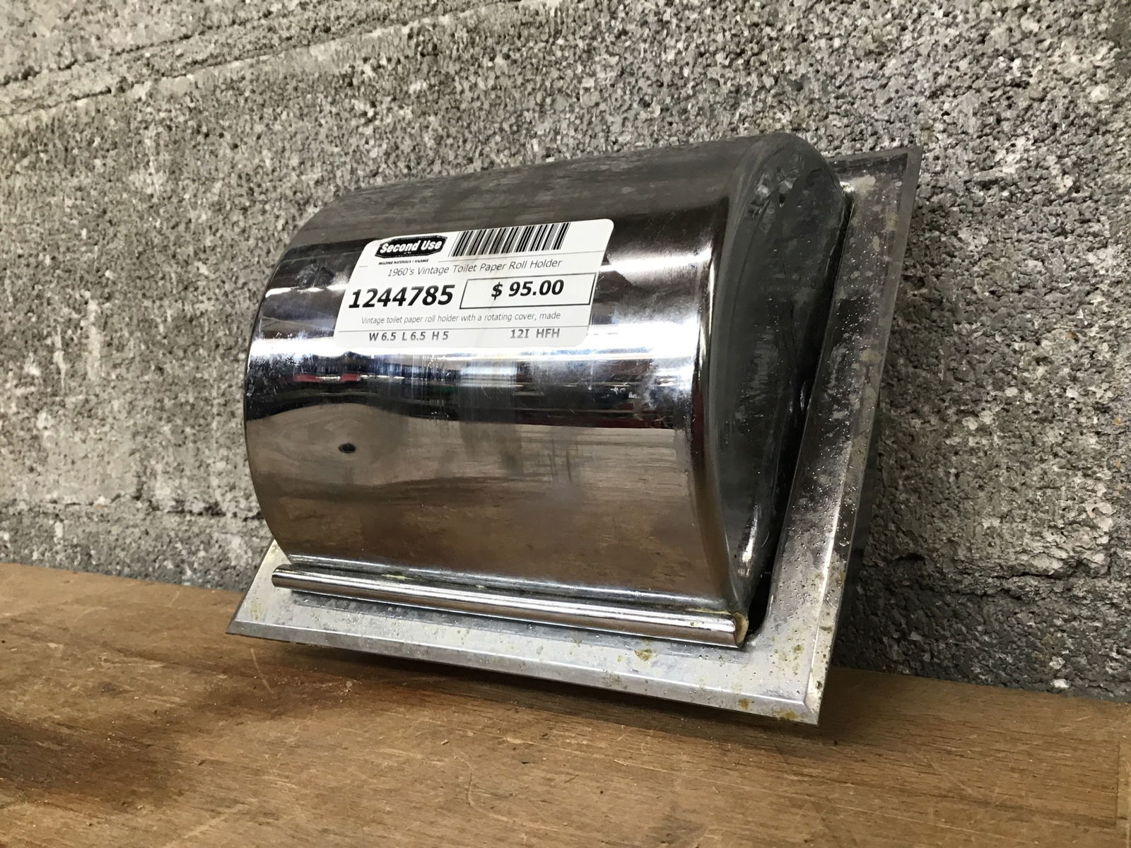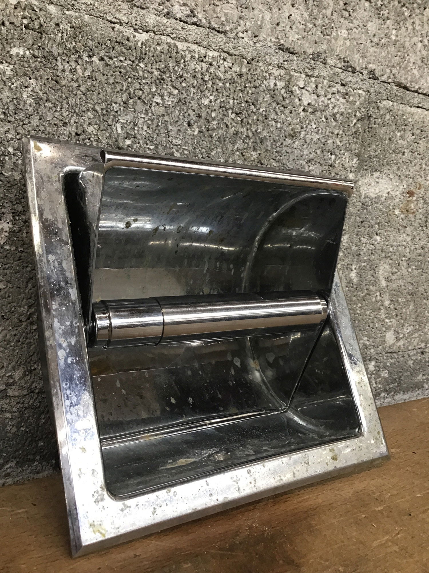 Vintage toilet paper roll holder with a rotating cover, made by Hall-Mack Model 378. Has a polished chrome finish with some minor rusting. Part of the body is a bit deformed, enough to make rotating the cover difficult. The cover does rotate but only with great effort, and has a dent in it.