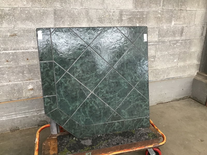 Put this under a wood stove to protect the floor from heat and embers! Green porcelain tile on a particle board backing, held together with angle iron. Meant to go in a corner.