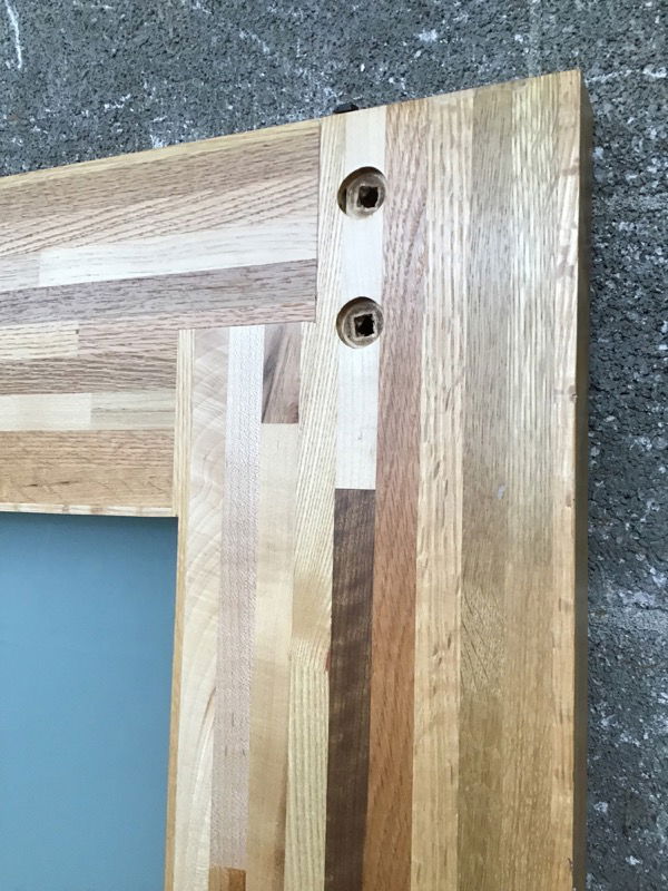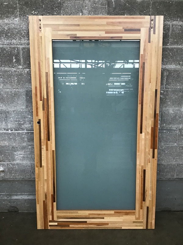 Behold this custom barn door, which features a butcher block like wood frame that is comprised of a potpourri of wood types, including; Walnut, Maple, Oak, Ash and Cherry wood all laminated together. It's really cool. Held within all of this woody fanfare is a pane of frosted and tempered glass, very modern. Sold with an ~8' long track, rollers, handles, and hardware pack (screws, fasteners & thumb turn latches. Item may have cosmetic damage. Photo may be representational.