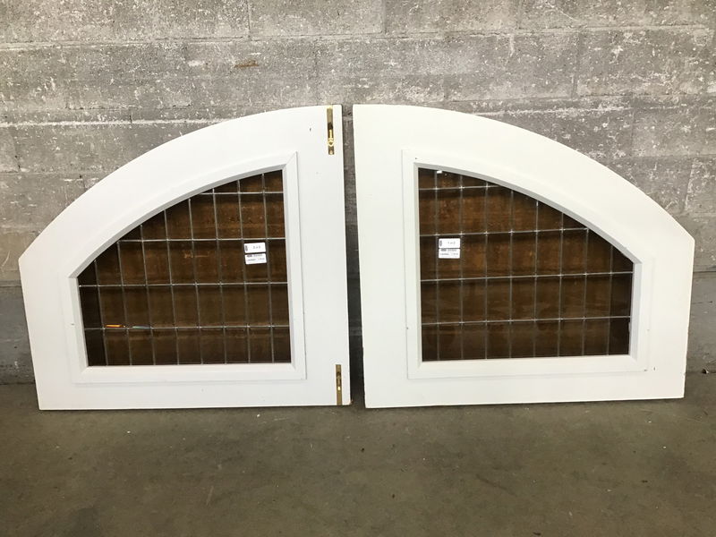 Perhaps once the statement topper to a fabulous dutch door, this pair of arched, solid fir "sashes" is ready for a new vision and place to call home! Each half features 38 lead divided, amber glass panes with beveled edges, making for some really cool light pass-thru. There are top and bottom slide locks on each, so you could make this a hinged pair if desired. Let us know what you do with these guys by sending pictures to [email protected]!! Width listed reflects both side-by-side. Each measures roughly 43.5". Height listed is for the tall edge, the short measures 22". Thickness measures 1.75".