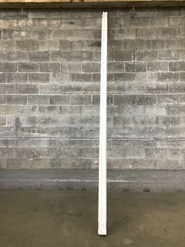 Three pieces of primed chair rail or wainscoting cap that are all at least 143 1/2" long.