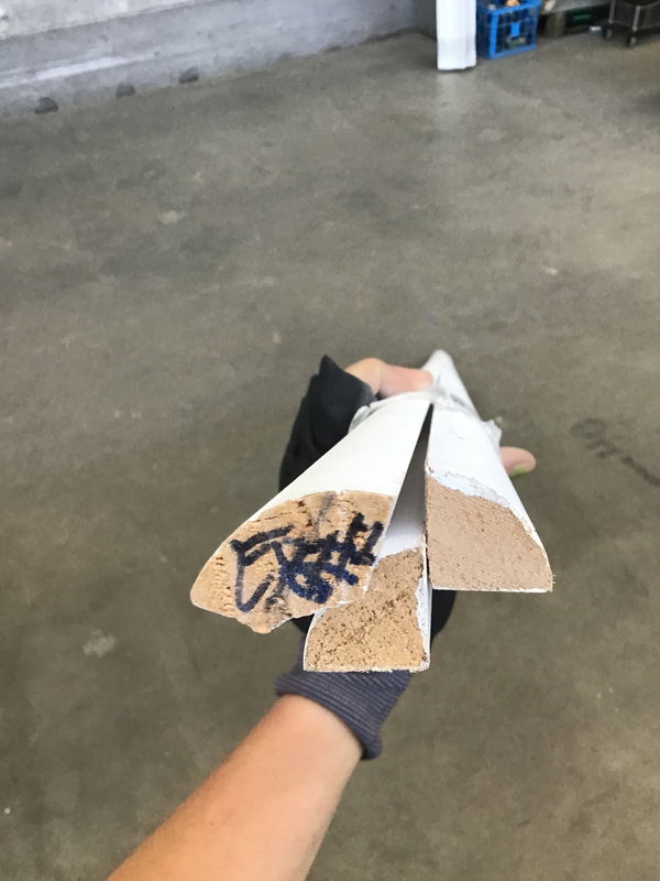 Three pieces of 1" thick primed fir quarter round that are 8' long or just over.