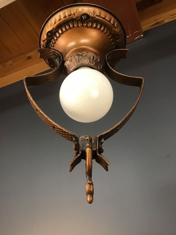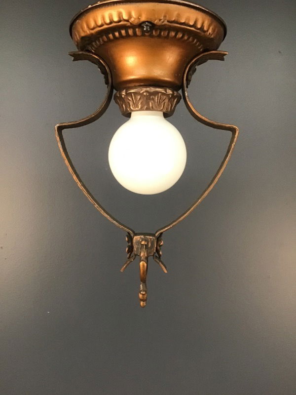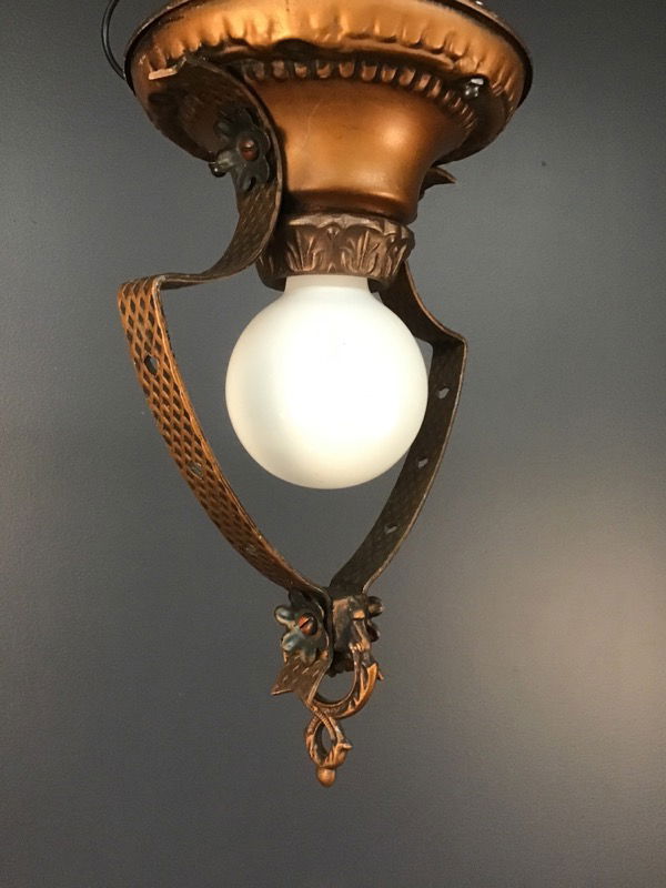 A copper finish 1920s Tudor Revival/Craftsman flush mount ceiling light in a copper and polychrome finish. Rewired in our on site light repair workshop