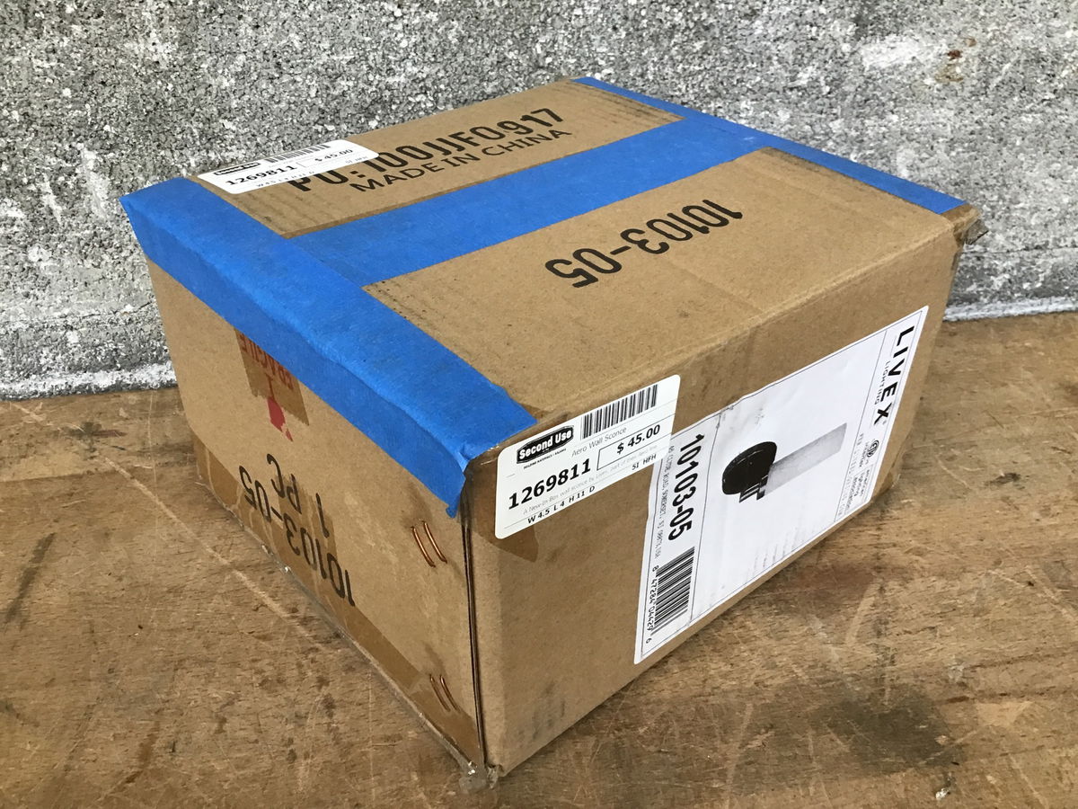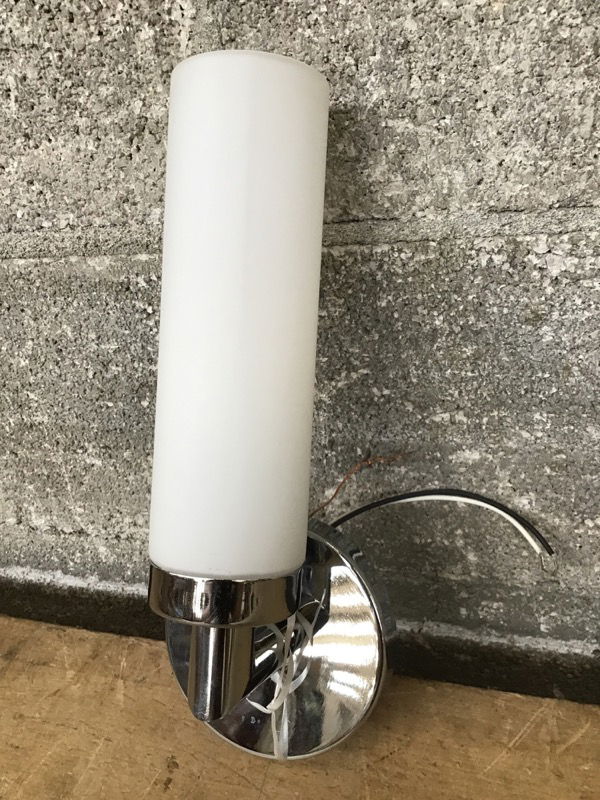 A New-In-Box wall sconce by Livex, part of their Aero line, featuring a single bulb behind a satin glass diffuser shade and a polished chrome finish to its construction. Retails new for about $80.