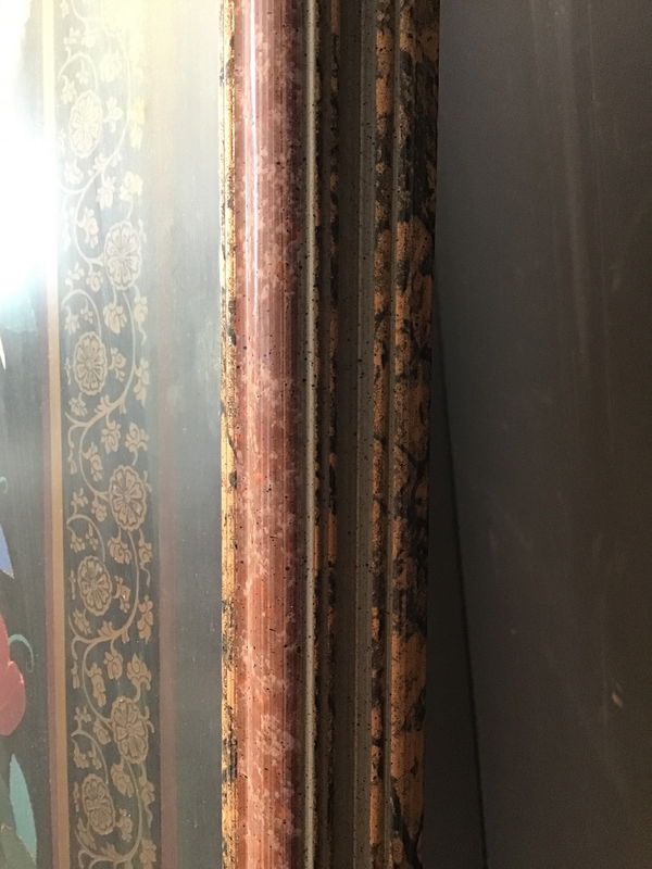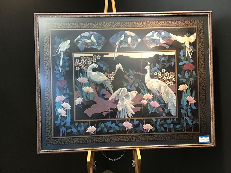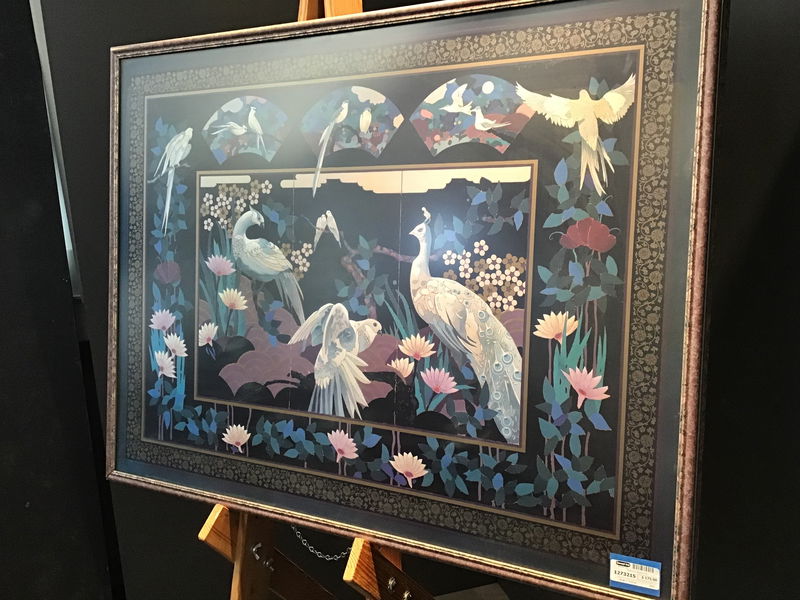 Spread your wings and soar into this stunning, gigantic, and extravagant print of various flora and fauna. Ornate peafowl and other birds surrounded by geometric flowers and greenery with an intricate floral border and black background. The other show stopper in this piece is the wood frame painted to look like marble and stone a unique frame really brings this whole shebang together to make a great statement for above a mantle or in a hallway.