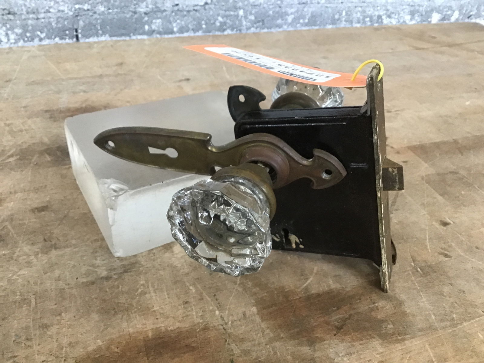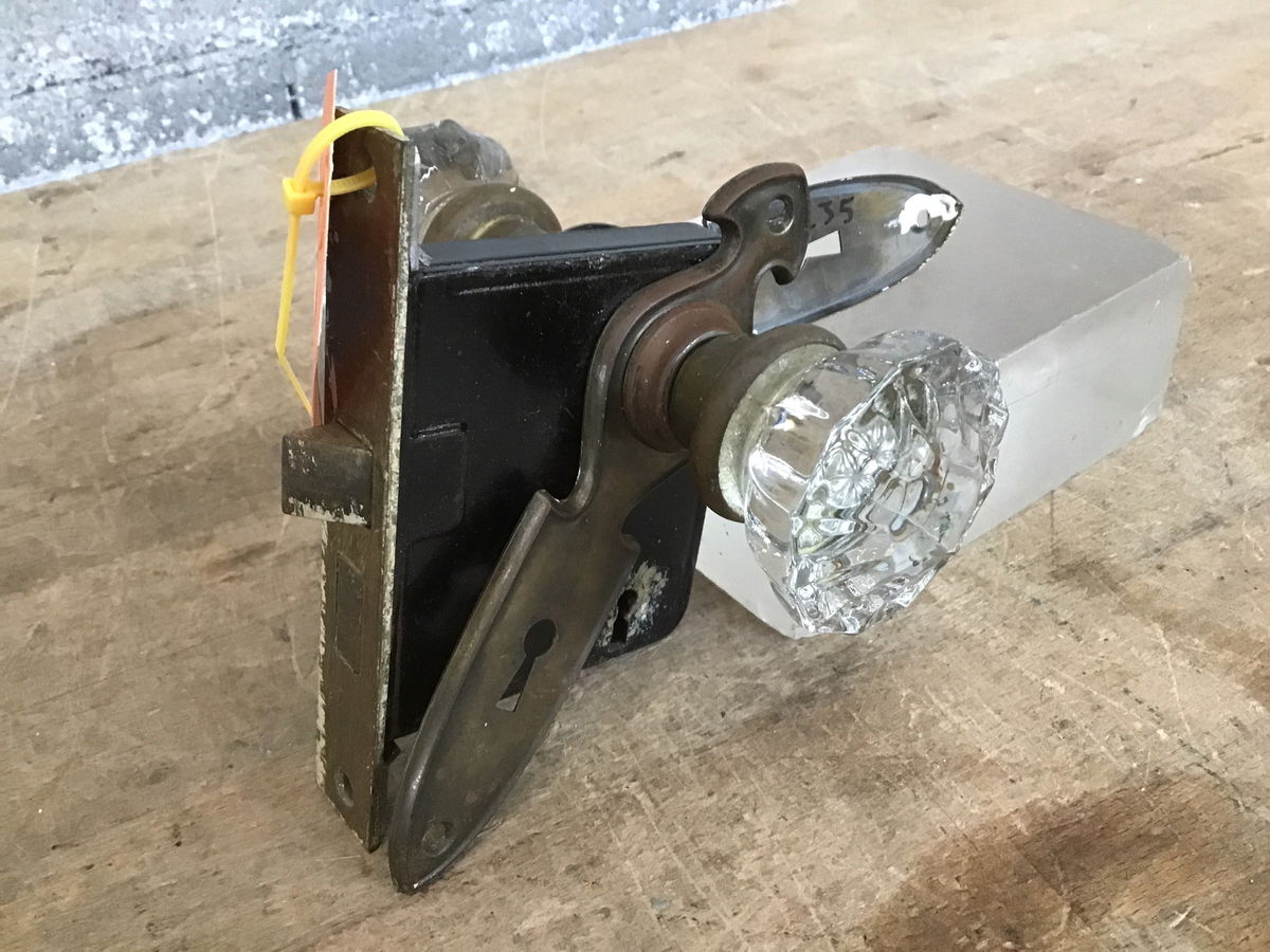 A full set for a vintage or antique door, with glass knobs, a spindle, aged brass escutcheons, and a classic mortise box.