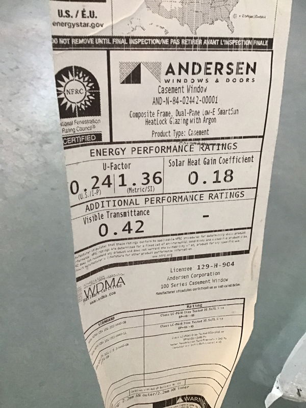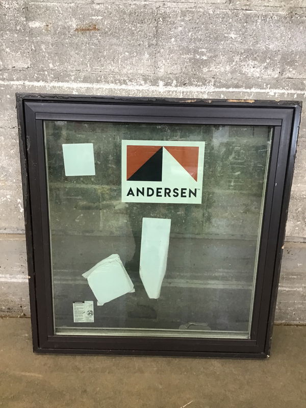 This Anderson window features a white fibrex frame, an awning style opening, and energy tags attached. Unfortunately, the locking mechanism is seized and needs work; price reflects.