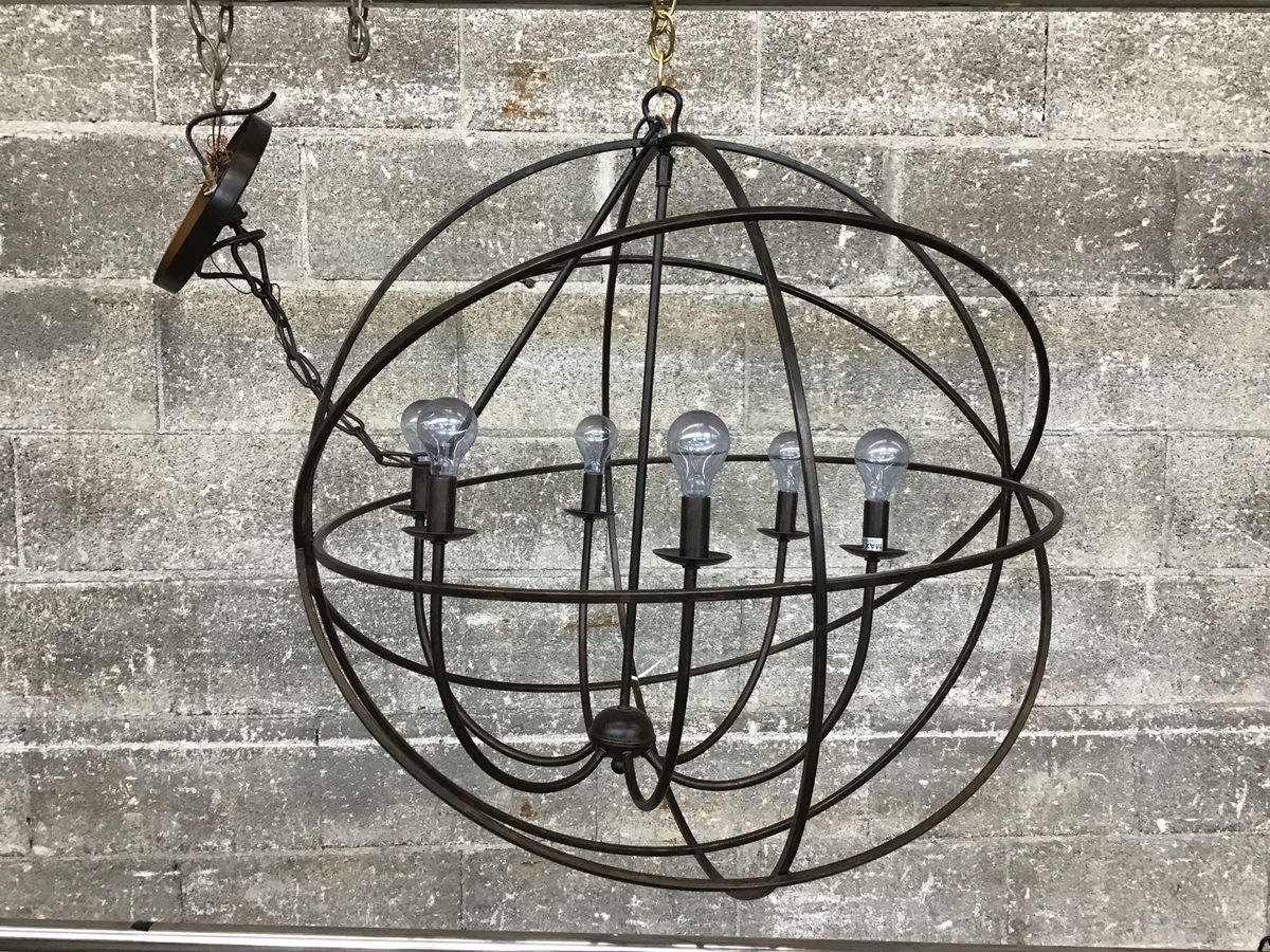 This 6-arm orb chandelier by Crystorama is just a few years old and appears to be in great shape. It features slim lines, a dark finish & 29.5" of chain (included in listed height).